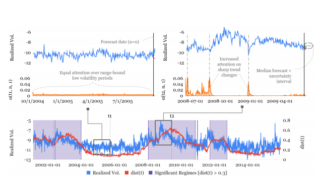 The concept of attention is central. It is the same as when someone watches a film. In a moment of nearly no action and absence of important information, not much attention is paid. However, at the introduction of details that are crucial to the understanding of the plot, one’s pupils enlarge. That enlarged pupil is the equivalent of the spike in the graph above. One can quite literally see what the machine is looking at. In fact, by analysing the components of the TFT attention layers, one can interpret the general relationships the TFT has learned and 1. Examine the importance of each input variable in prediction; 2. Visualise persistent temporal patterns; 3. Identify any regimes or events that lead to significant changes in temporal dynamics. In fact, attention-based models provide both perspectives: direct and indirect. And this is key because, as we said, indirect techniques can only provide a general overview of what was learned during training and which were the most important variables that were used. But these rules may not be fully applicable in prediction. Direct techniques, on the other hand, can directly highlight those variables in real-time using specific end-user data, which is typically different from training data.