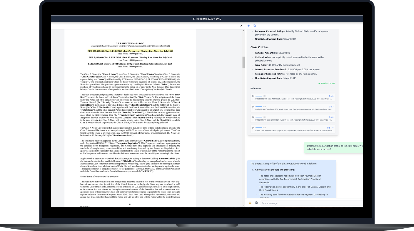 While the market is flooded with generic “chat-to-document” tools—essentially advanced versions of ChatGPT that extract and summarize text—Prospekto stands apart by being purpose-built for structured finance prospectuses.